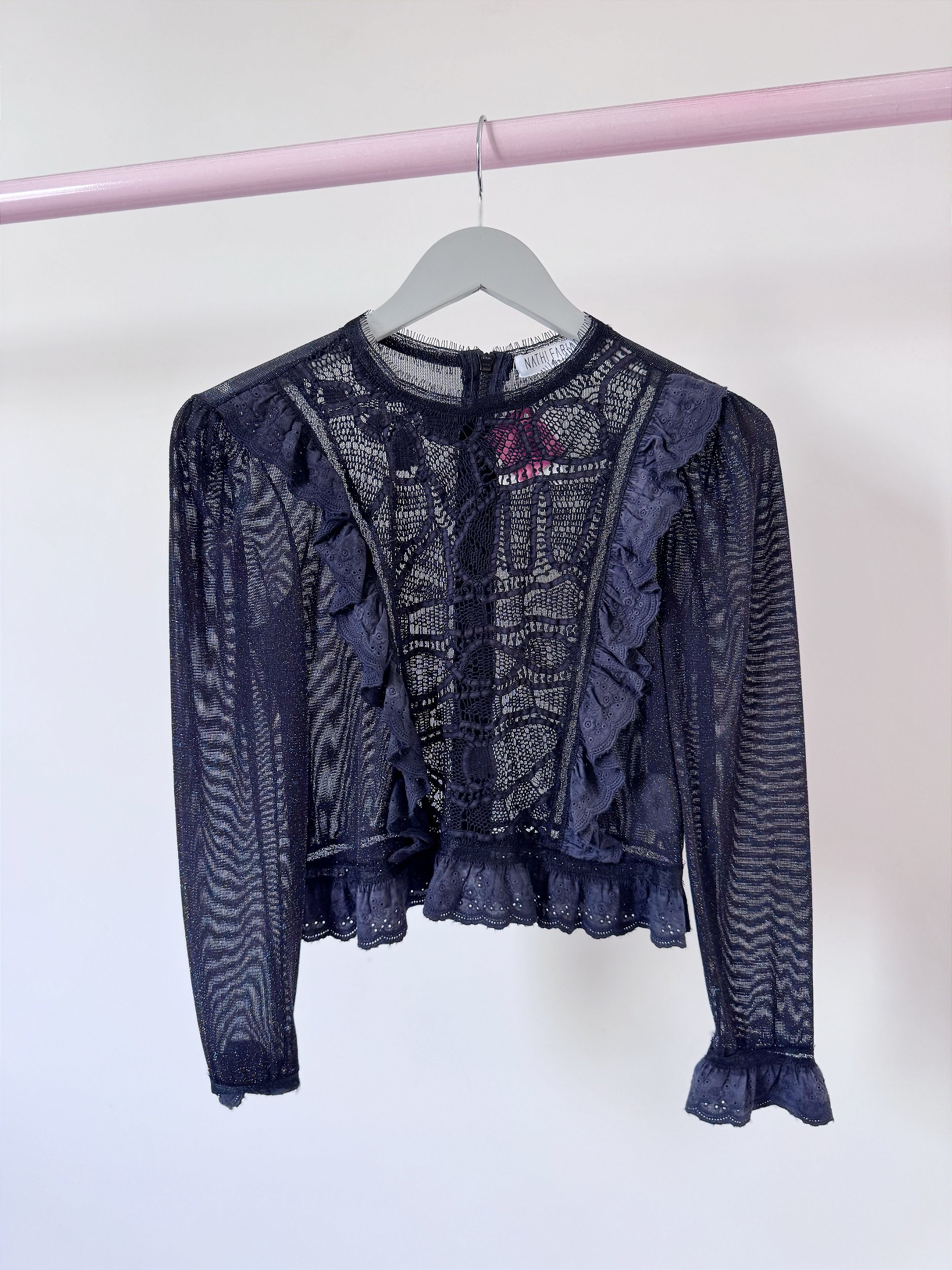 Blusa confeccionada em lurex preto e colorido com aplicação de renda fontal. Peça com transparência. Não acompanha forro. Tamanho P
