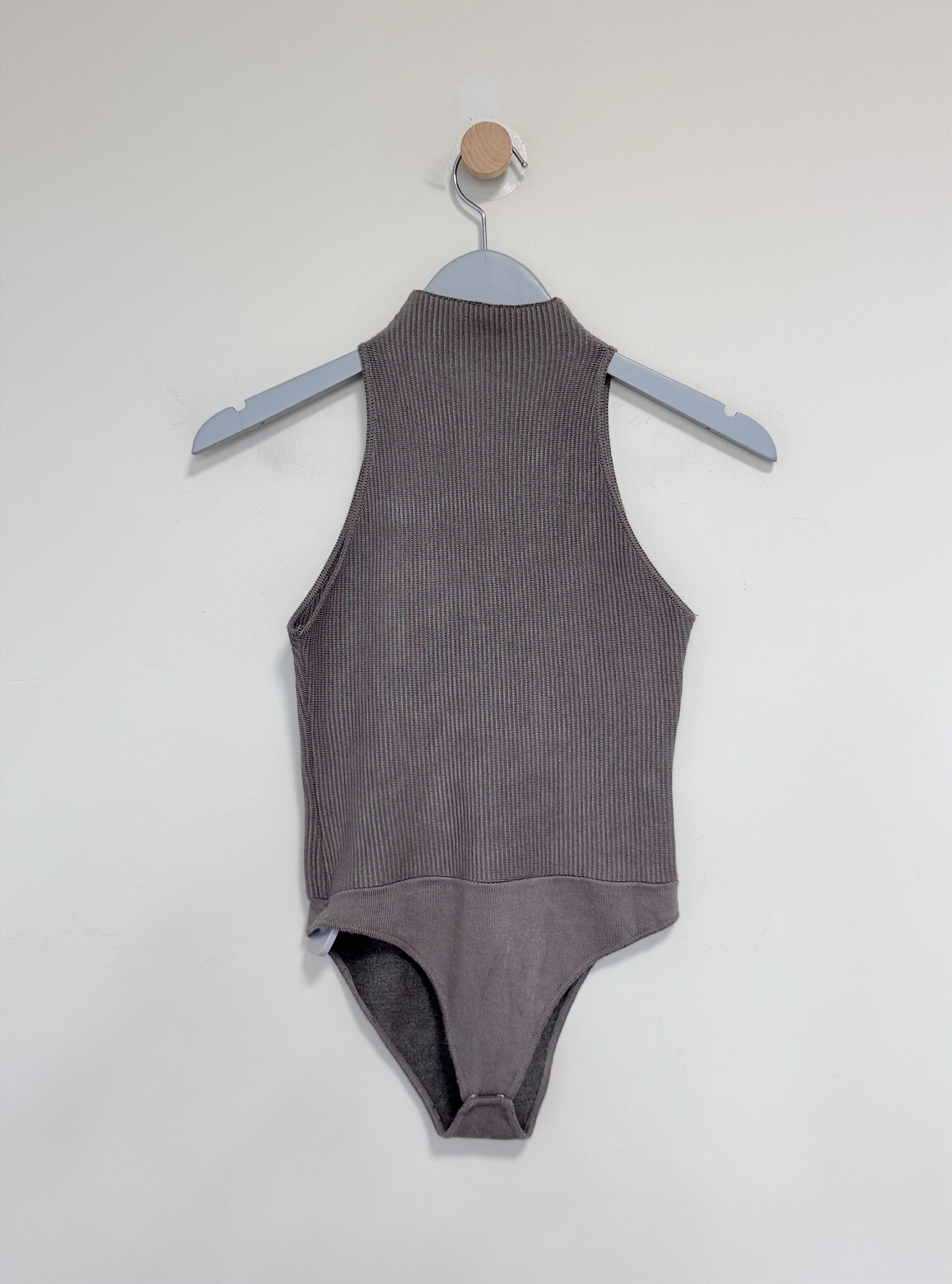 Body confeccionado em tricot com elastano. Possui fechamento por baixo em botões de pressão e gola careca semi alta. Tamanho de etiqueta PP