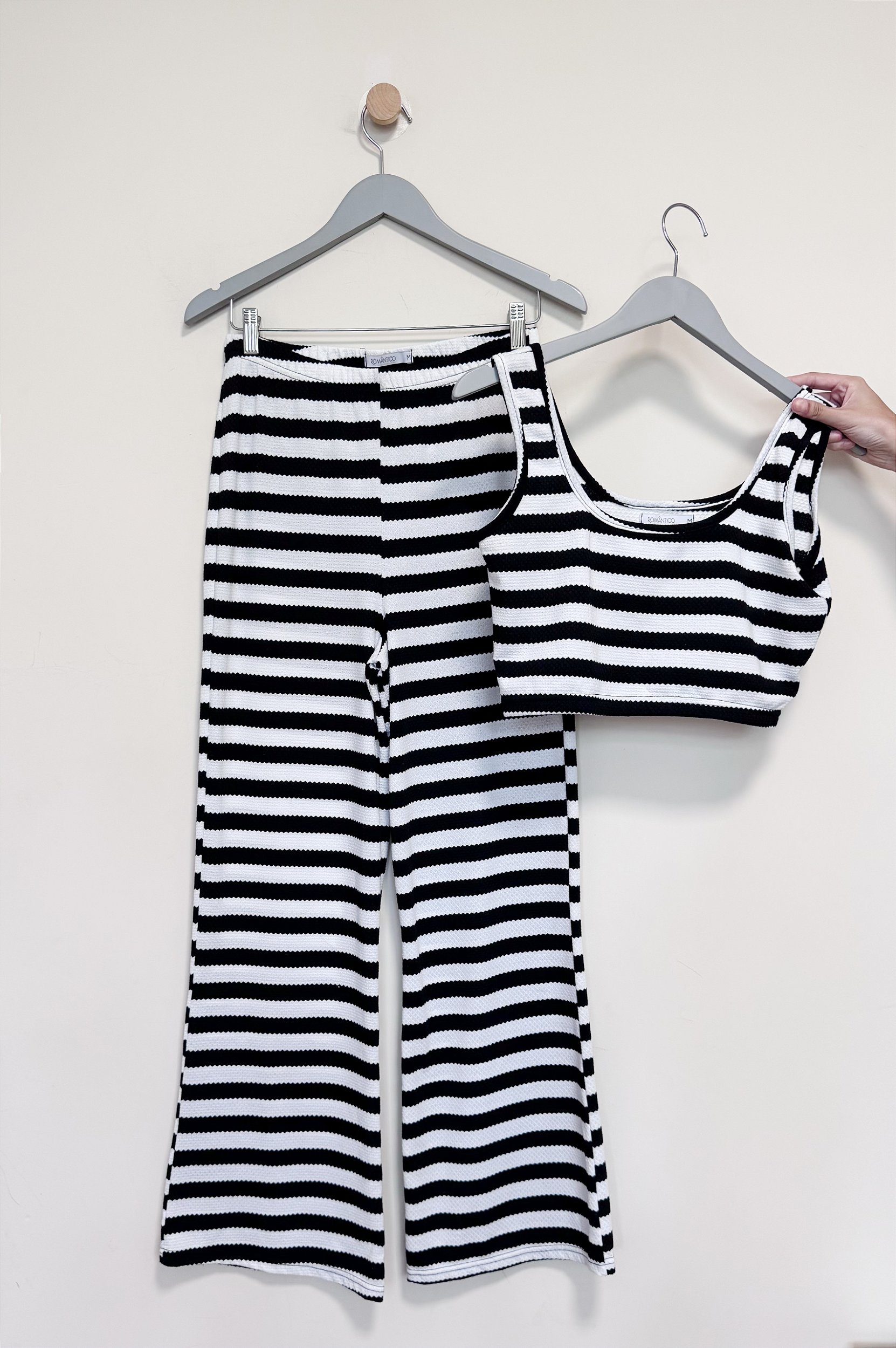 Conjunto listrado de top e calça cintura cÓs elástico. Tamanho M
