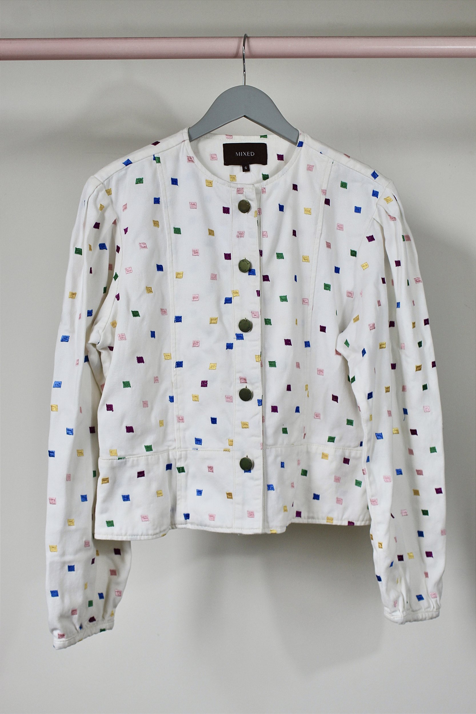 Jaqueta em jeans 100% algodão com bordados em toda a peça; Fechamento em botões e modelagem estruturada. Tam G