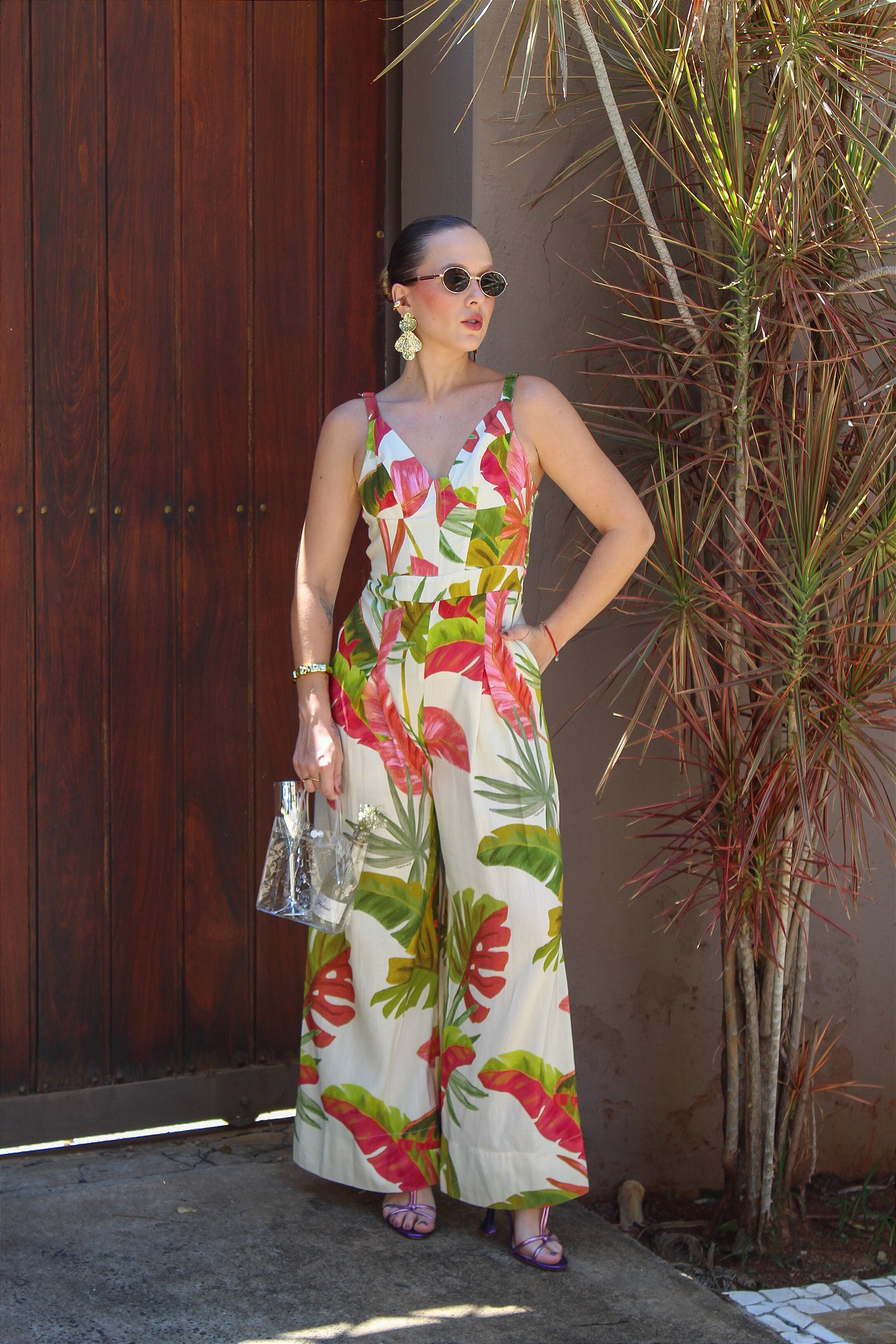 Macacão confeccionado em tecido leve com toque de linho e viscose. Possui calças estilo pantalona e cintura desenhada. Tamanho P