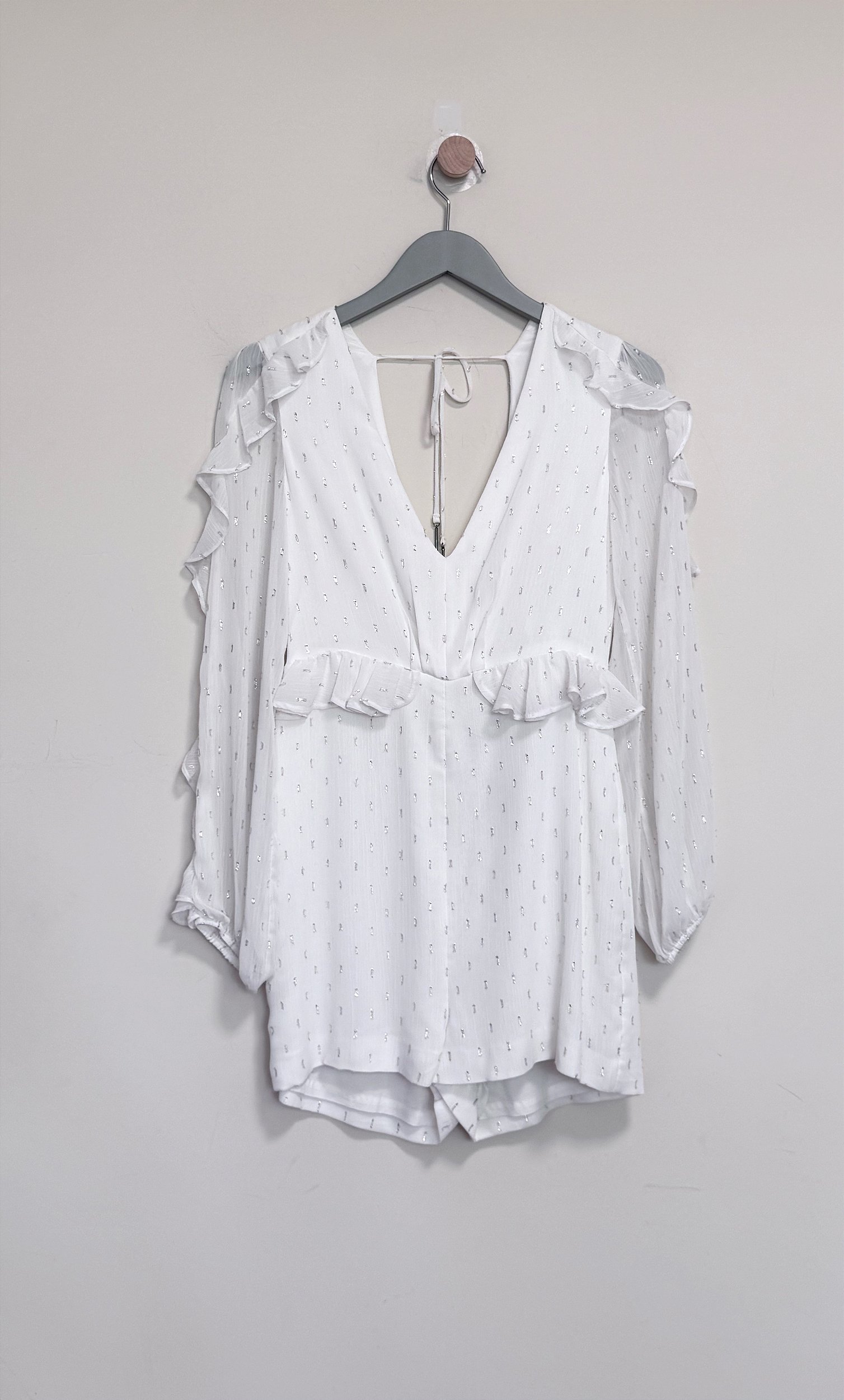 Macaquinho confeccionado em tecido leve com detalhes prateados metalizados. Tamanho P