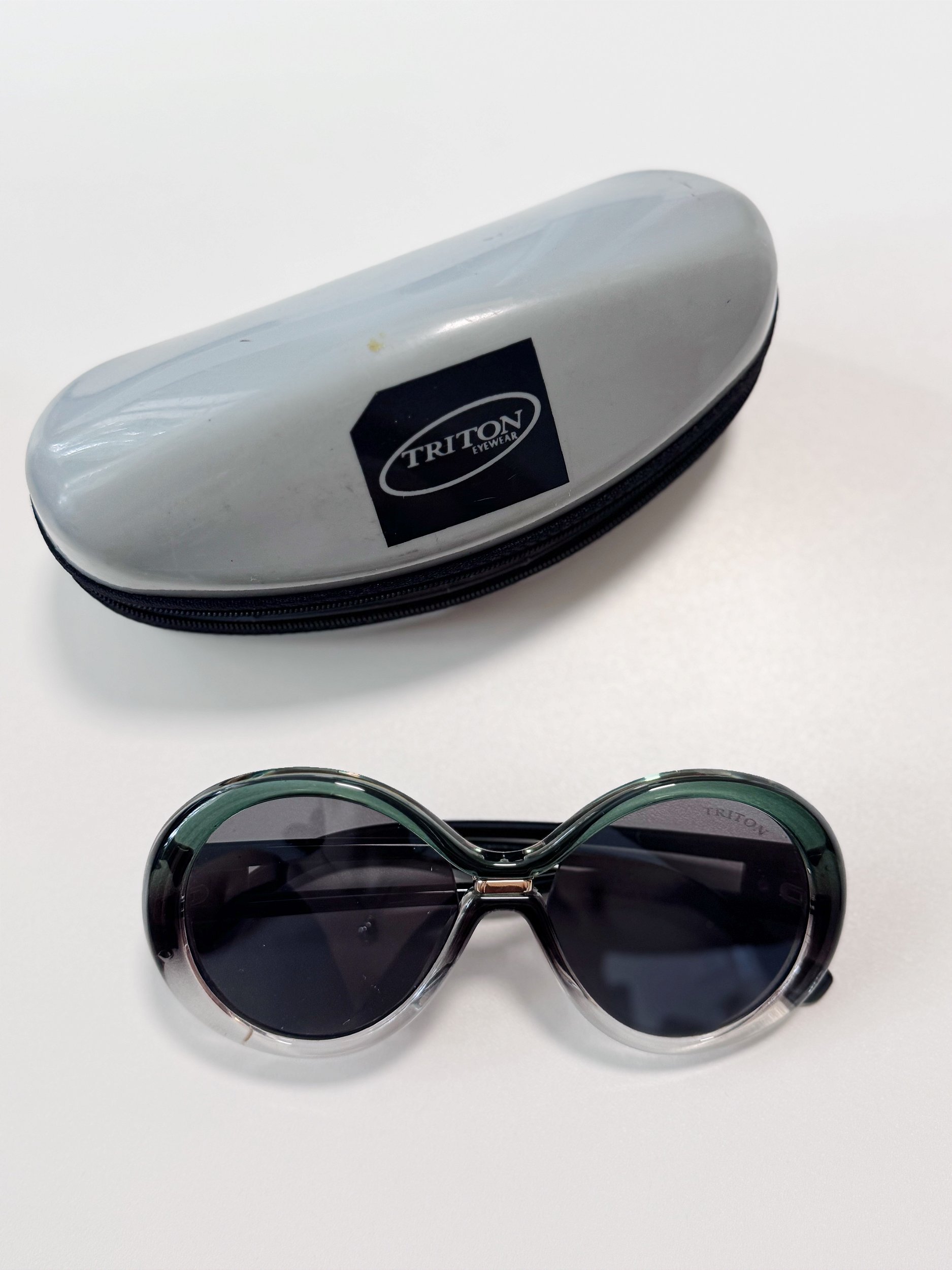 óculos de sol em acetato degradê tons de verde, preto e cinza. lentes pretas claras e hastes pretas. Possui sutis sinais de uso que não impedem o uso do produto. Bonito, hastes firmes e total capacidade de proteção UV-UVA