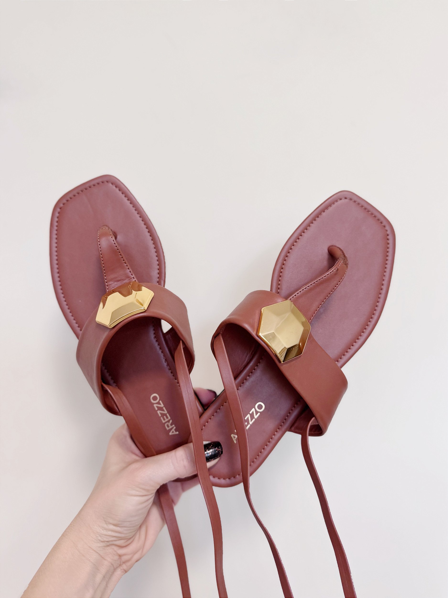 Rasteira gladiadora com aplicação de metal e cordão longo para amarrar nas pernas. Tamanho 36