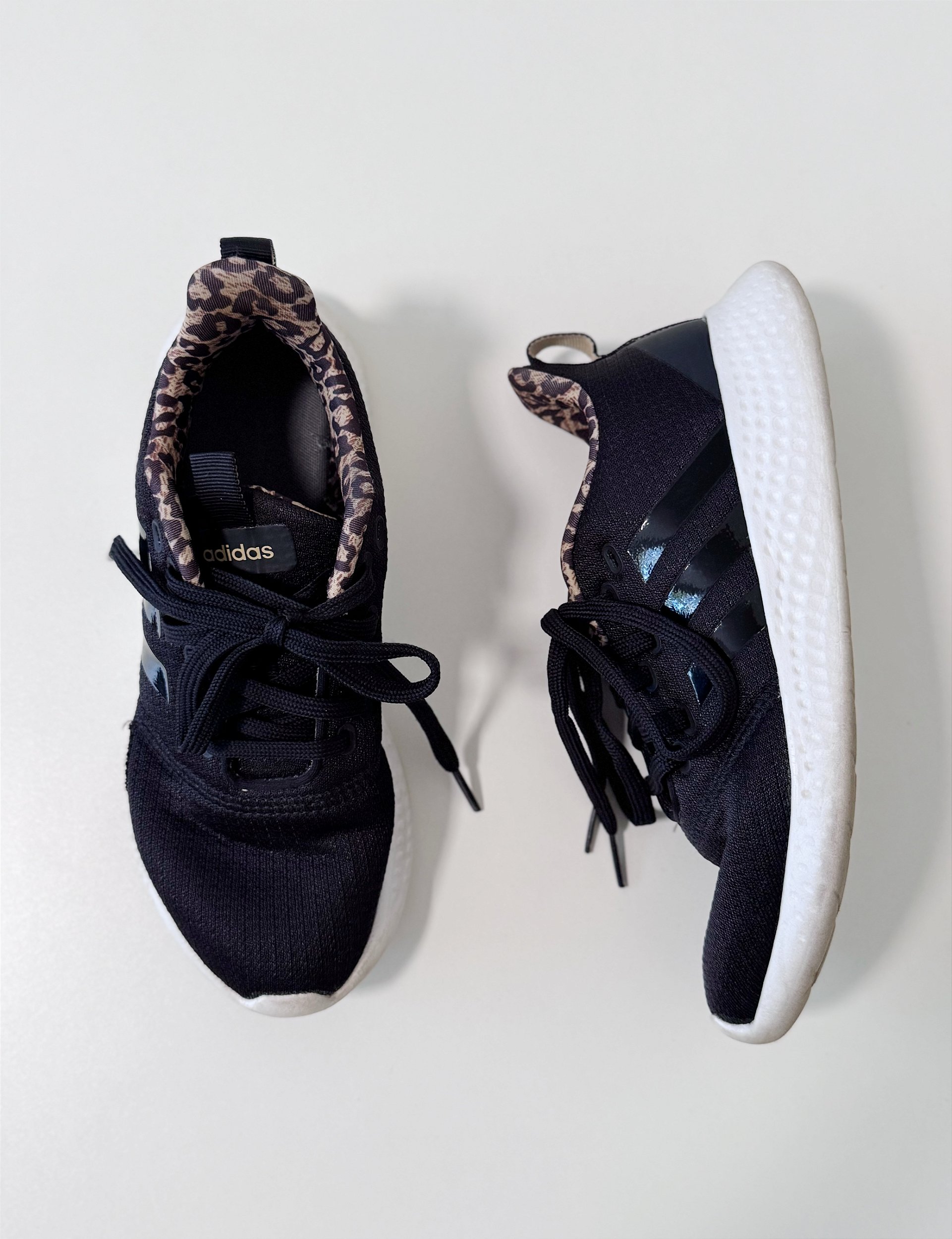 Tênis confeciconado em tecido preto resistente e forro animal print. Sola emborrachada e material leve e confortável para academia e caminhadas. tamanho 36