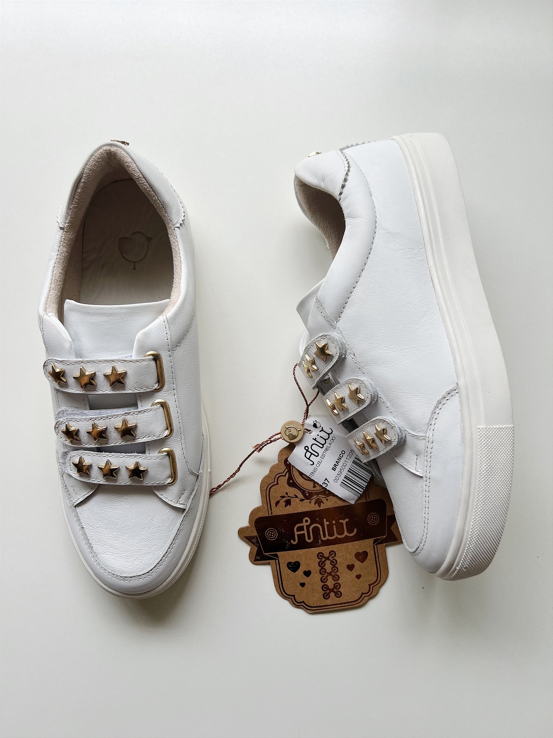 Tênis branco com fechos em velcro com aplicações douradas e solado emborrachado. tamanho 37