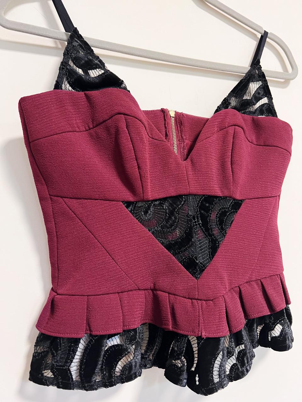 Top confeccionado em tecido encorpado estilo corset. O modelo possui forro, busto maleável (sem bojo), aplicação de babados e rendas pretas. Tamanho P