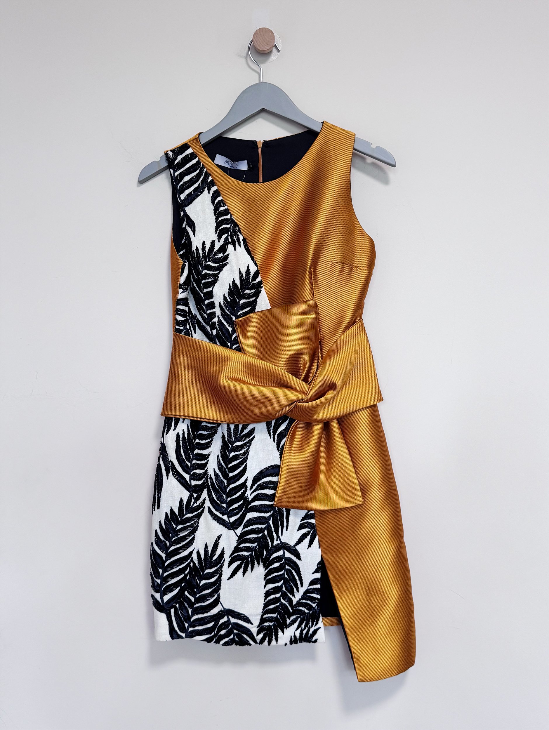 Vestido confeccionado em tecido encorpado e corte acinturado. Não possui elastano. O tecido dourado é um jacquard com seda na composição. Já a parte mais clara é texturizada com bordados em canutilhos apresentando toda a maestria da marca. Tamanho de etiqueta 40