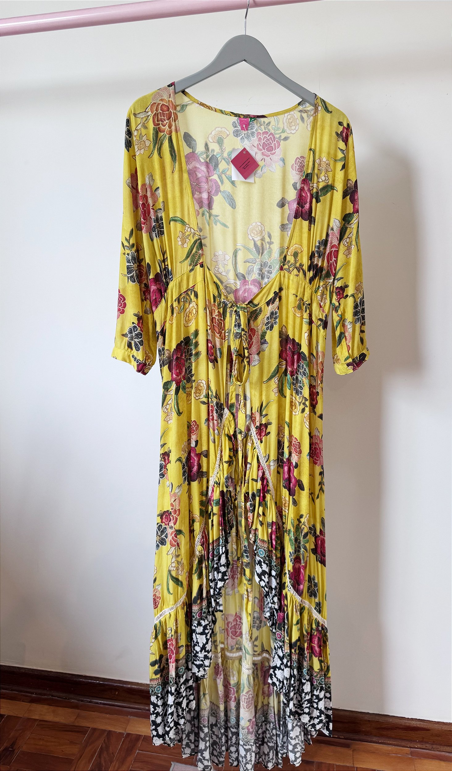 Vestido modelo envelope com decote em V e saia rosada com babados. Possui faixas de amarração para ajuste na cintura. tamanho M