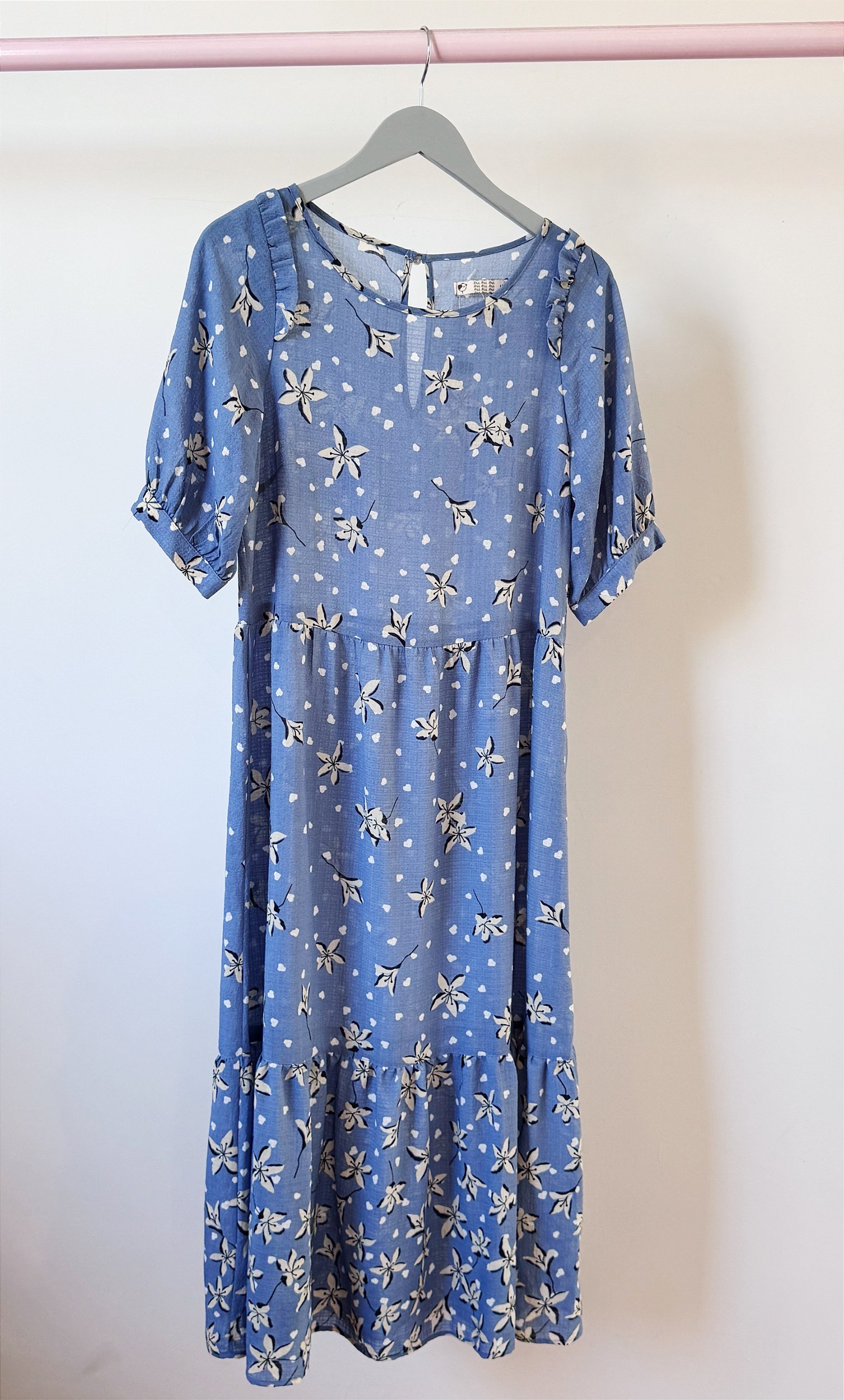 Vestido confeccionado em tecido leve com estampa exclusiva. Possui mangas médias, comprimento midi e saia reta. Não possui FORRO. tamanho M