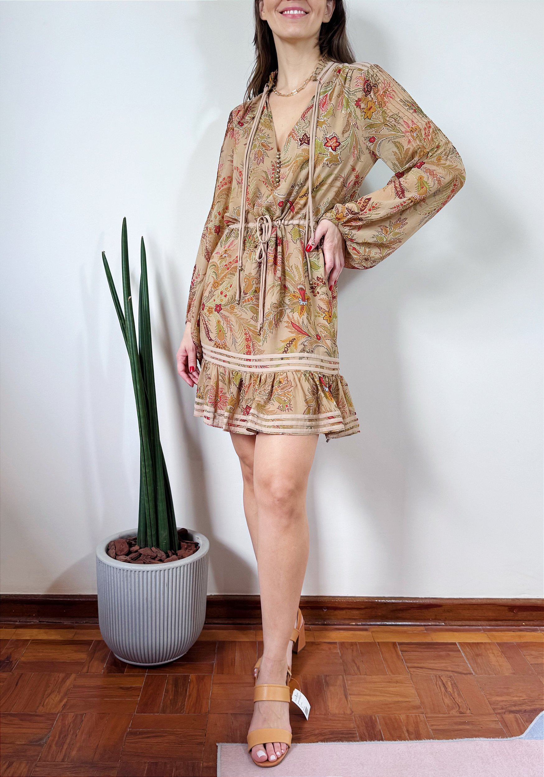Vestido confeccionado em tecido leve com forro. Possui cordão de ajuste na cintura. Tamanho M