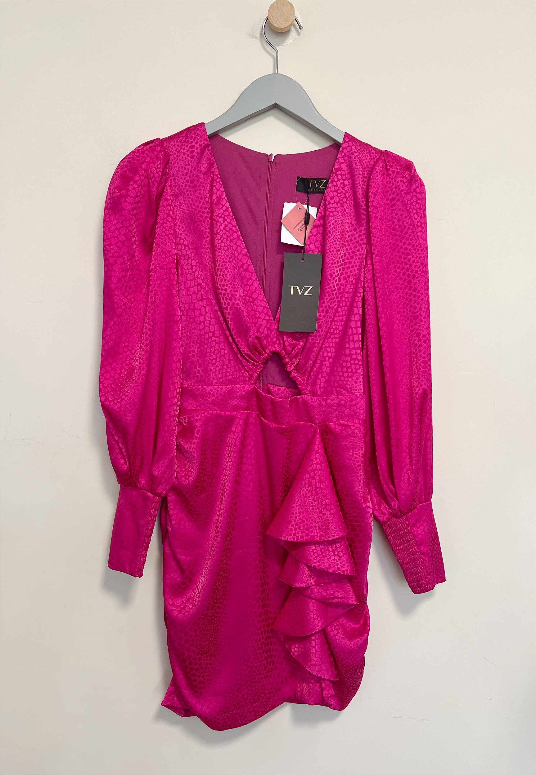 Vestido em tecido acetinado com textura e destalhes drapeados. Sem elastano. Tamanho 36