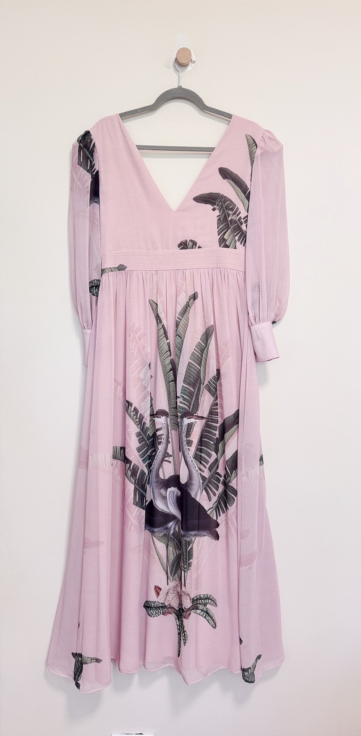Vestido manga longa confeccionado em tecido leve. Possui forro, saia evasê com estampa exclusiva e mangas levemente amplas. Ideal para momentos inesquecíveis como casamentos, formaturas e festas elegantes. tamanho 42