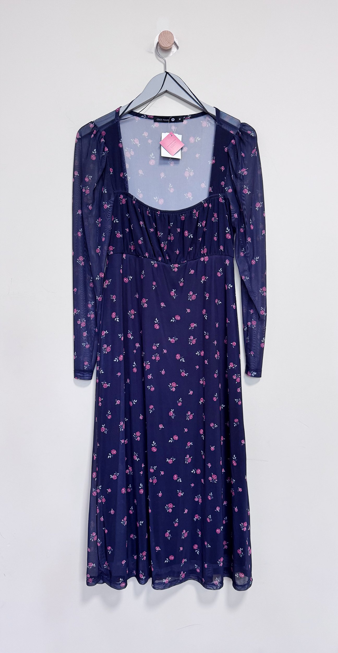 Vestido confeccionado em tecido fluído com mangas e parte superior de tule. Tamanho M